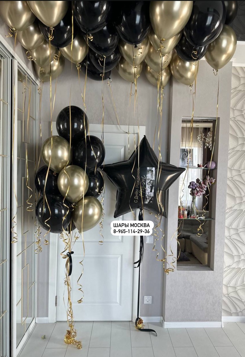 30 шаров под потолок , большая звезда с фотографиями и фонтаном