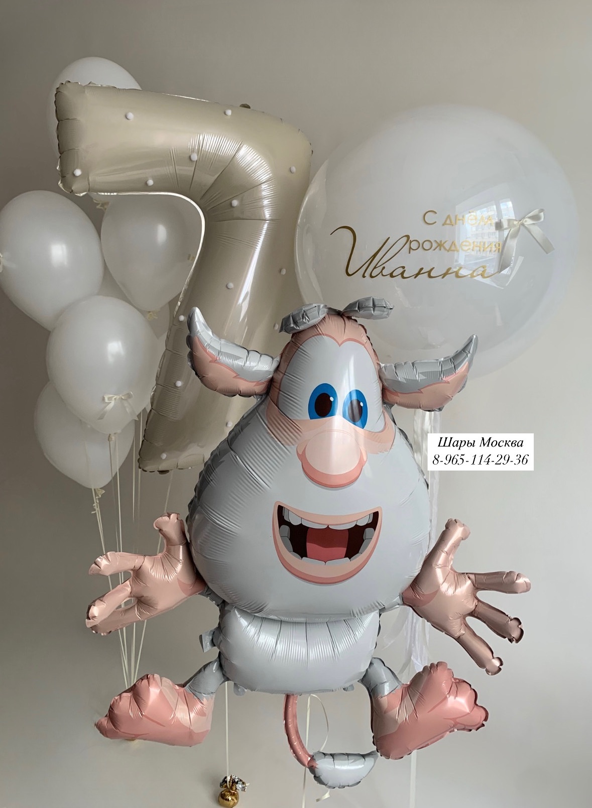 Большая бежево-кремовая цифра , шары с бантиками , буба с большим шаром