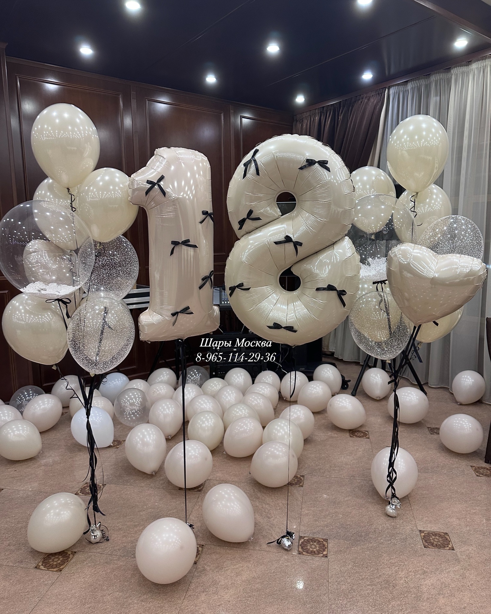 Большие бежево-кремовые цифры с бантами, бежевые воздушные шары