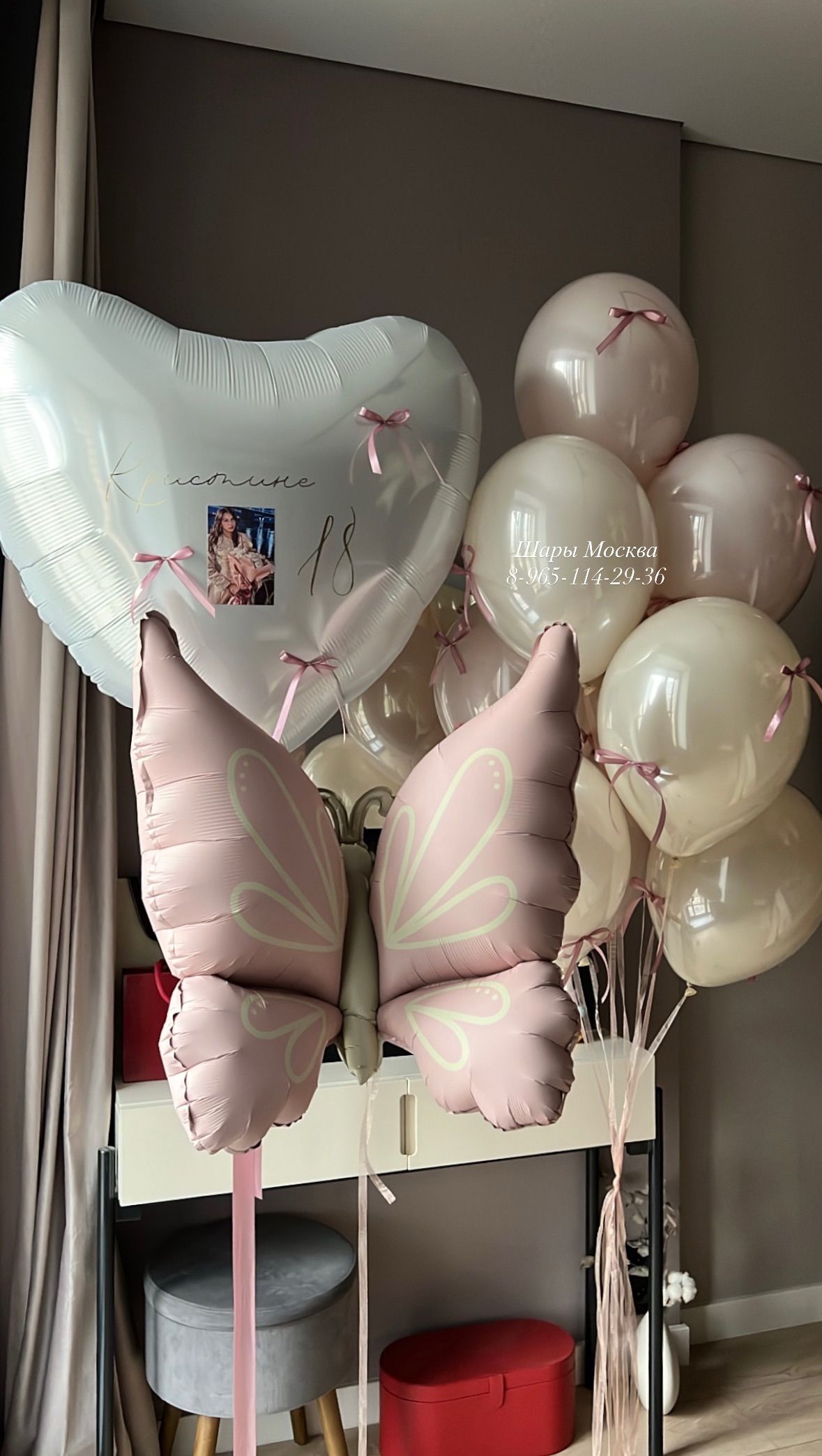 Большое сердце с фото и надписью, стеклянные воздушные шарики с бабочкой и бантиками