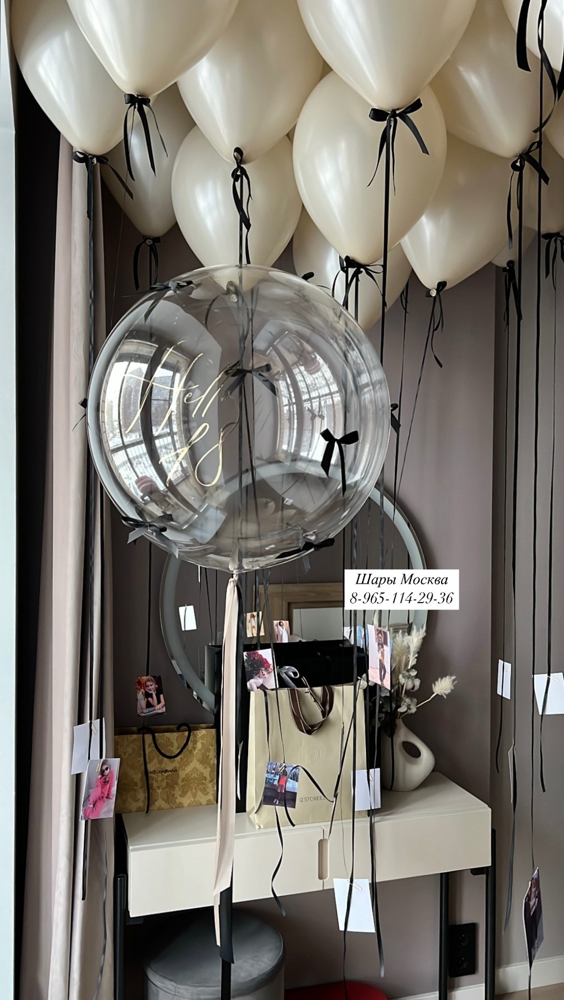Большой прозрачный шар с надписью и бантиками , 15 бежевых шаров под потолок с бантиками