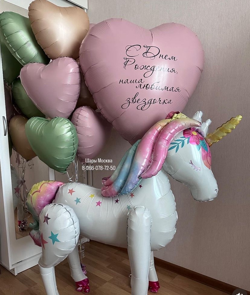 Большой шар -единорог с сердечками и большим сердцем пыльная роза с любой надписью