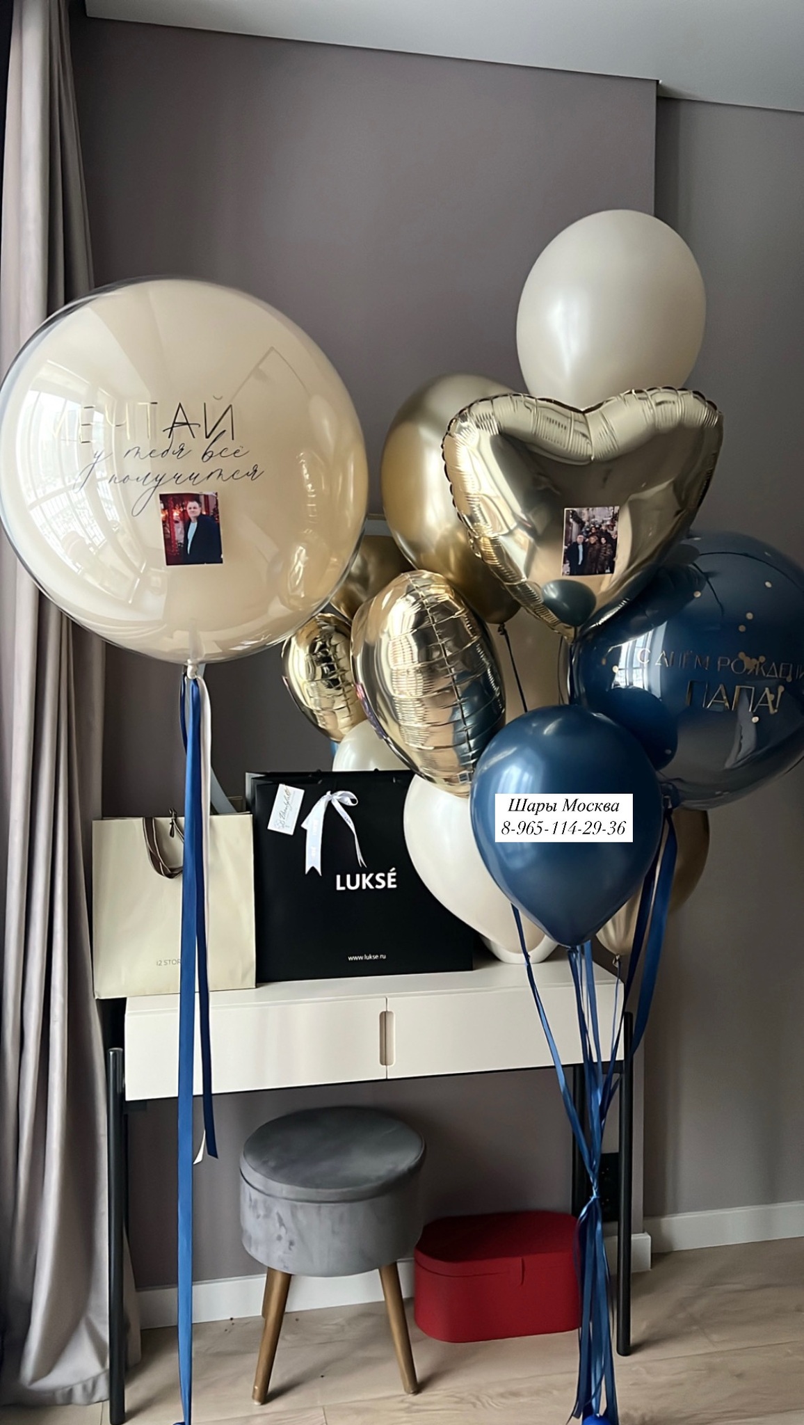 Большой стеклянный шар с фото, фонтан с воздушными шарами