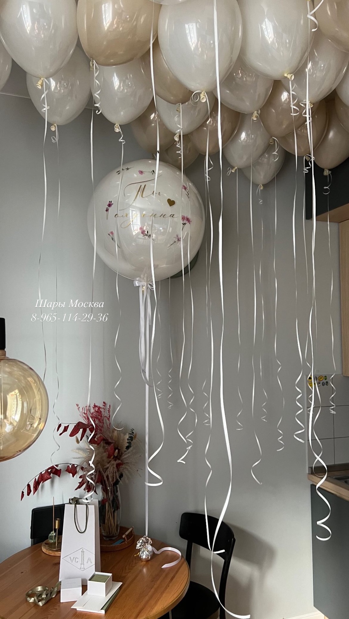 Большой стеклянный шар с надписью и цветами,30 бежево- белых стеклянных шаров под потолком