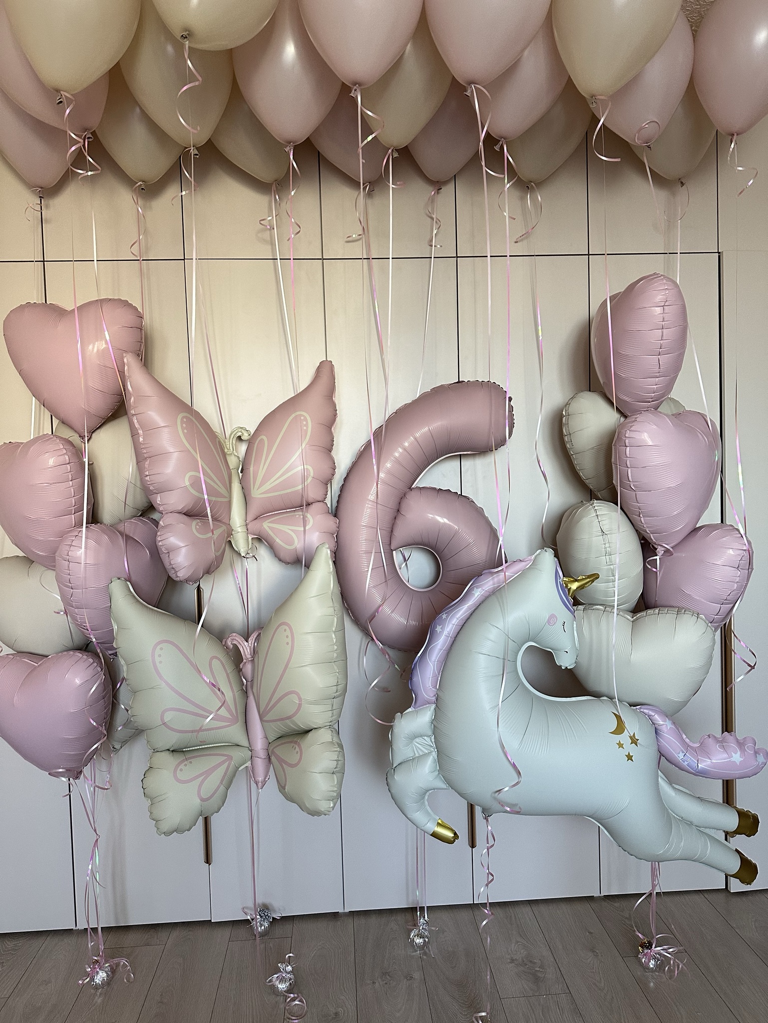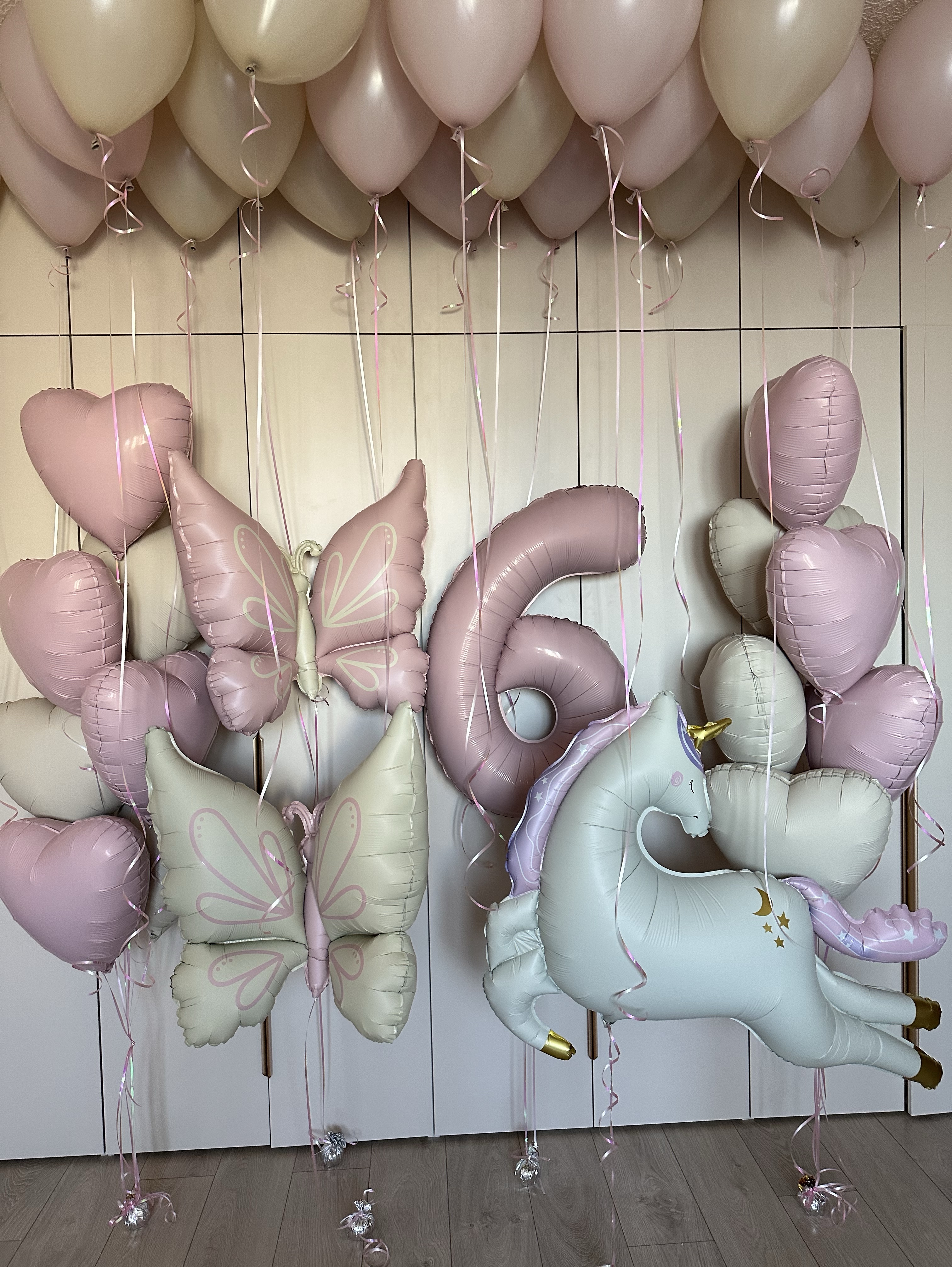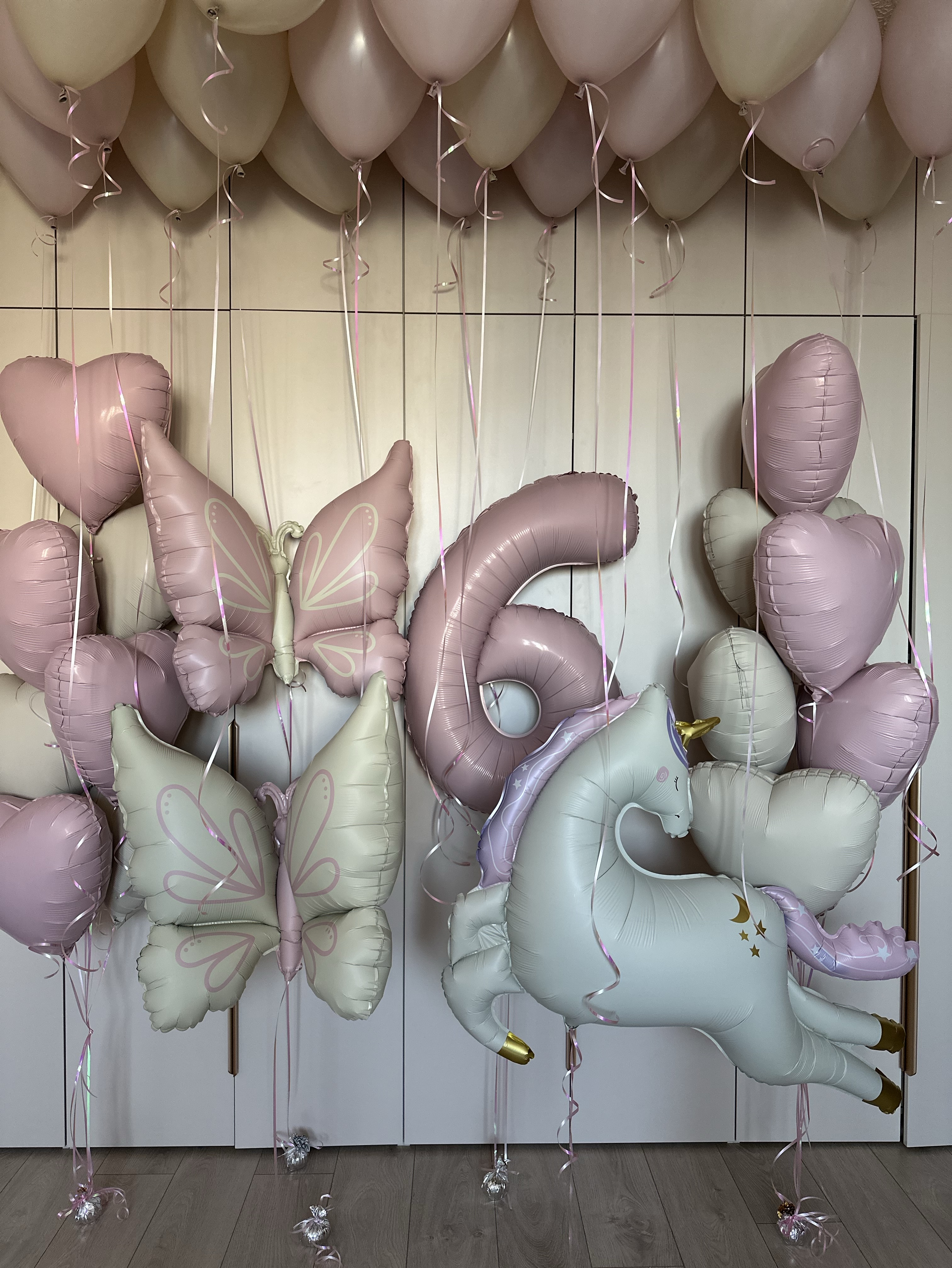 Нежный набор воздушных шаров с сердечками, бабочками, цифрой и единорогом