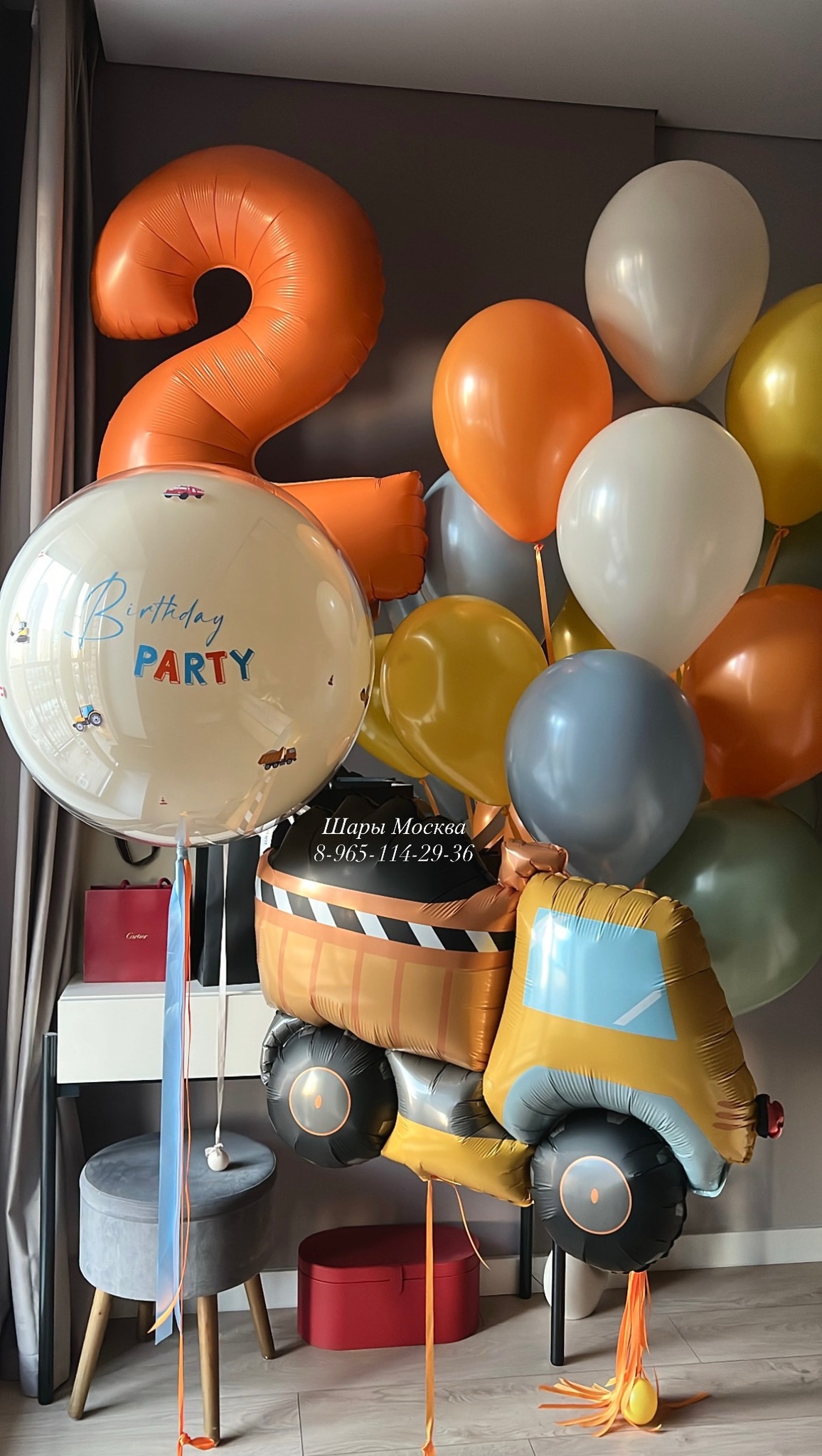 Самосвал с большой оранжевой цифрой и воздушными шарами ( любая надпись на большом шаре в подарок)