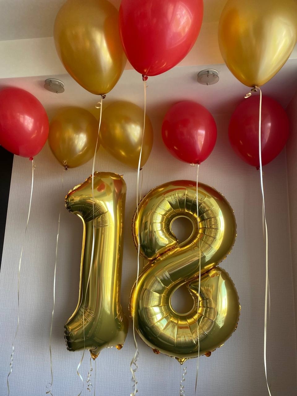 Большие золотые цифры с шарами под потолок(золото, красный металлик)